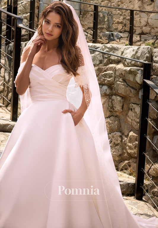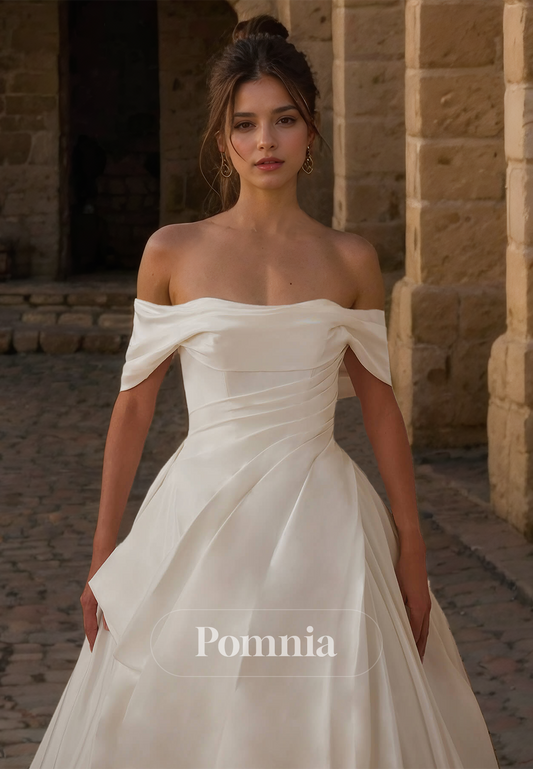 Charming Off-Shoulder Cap Sleeves A-Line Court Train Satin Wedding Dress