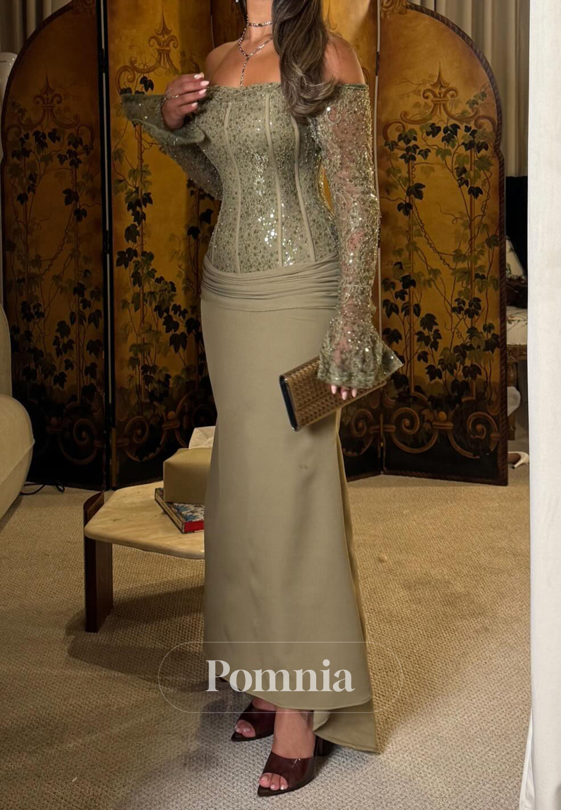Elevate your evening look with the Dusty Sage Long Sleeves Off-Shoulder Ruched Evening Dress. Designed with elegant off-shoulder long sleeves and delicate ruching, this dress contours the body for a flattering silhouette. Its muted dusty sage color adds a sophisticated touch, perfect for formal occasions. Crafted to combine style and comfort, it ensures you stand out gracefully at any event.