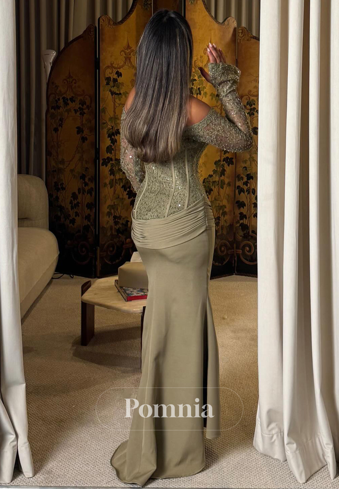 Dusty Sage Long Sleeves Off-Shoulder Ruched Evening Dress