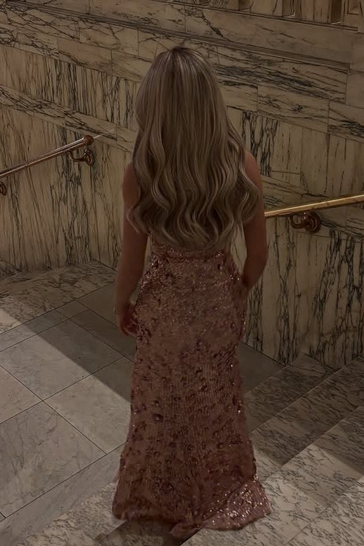 Sparkly Sheath Strapless Rose Pink Sequins Long Prom Dress with Slit x 1;
