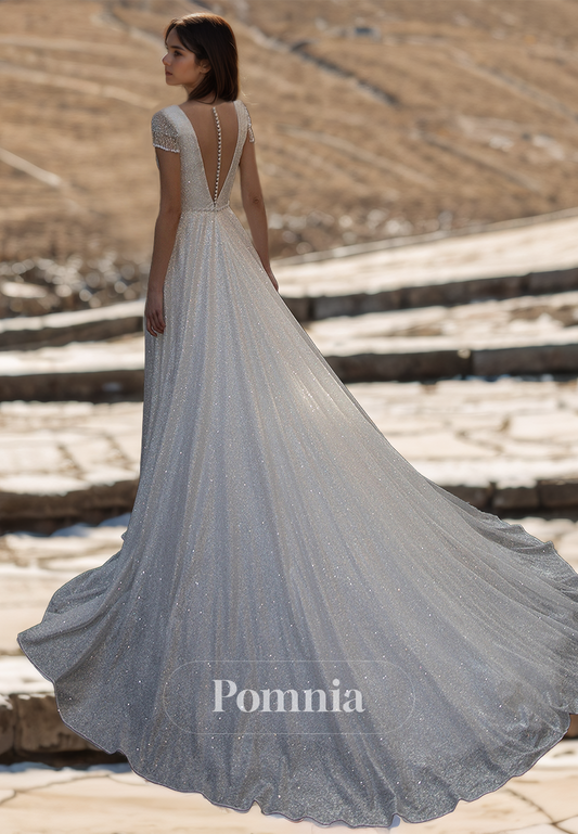 Sparkly Short Sleeves V-Neck Empire-Waist Backless Satin Wedding Dress