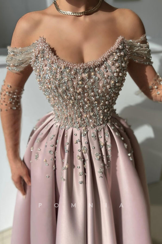 A-Line Strapless Sleeveless Empire-Waist Pearls Evening Dress
