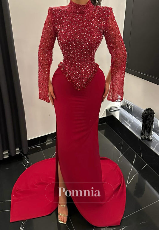 Red Long Sleeves High Neck Sequins Slit Evening Dress