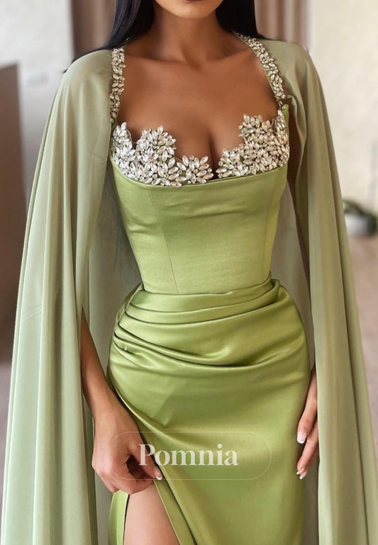 Dusty Sage Cap Sleeves Sweetheart Slit Ruched Evening Dress
