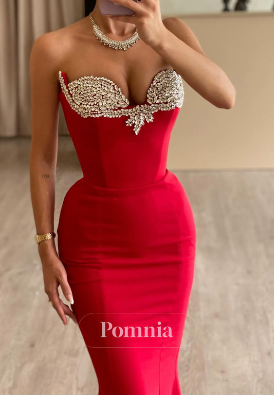 Sheath Red Strapless Sleeveless Beads Evening Dress