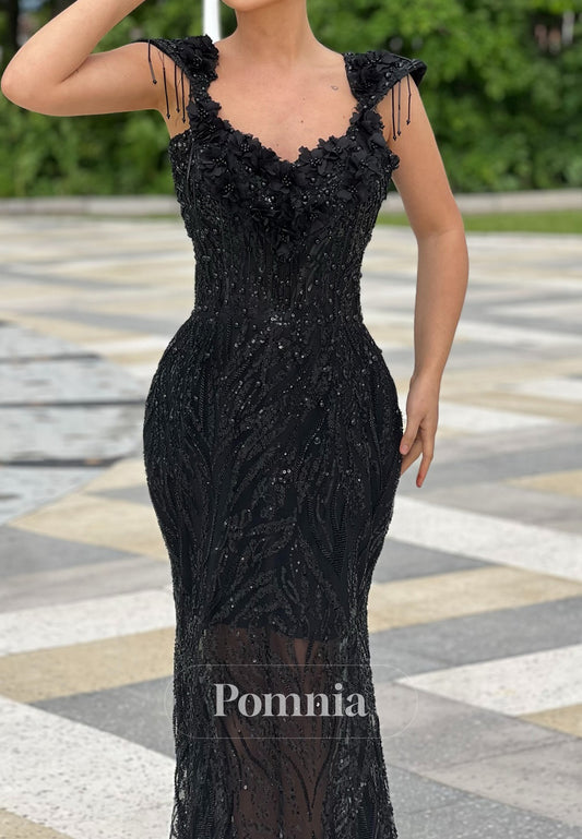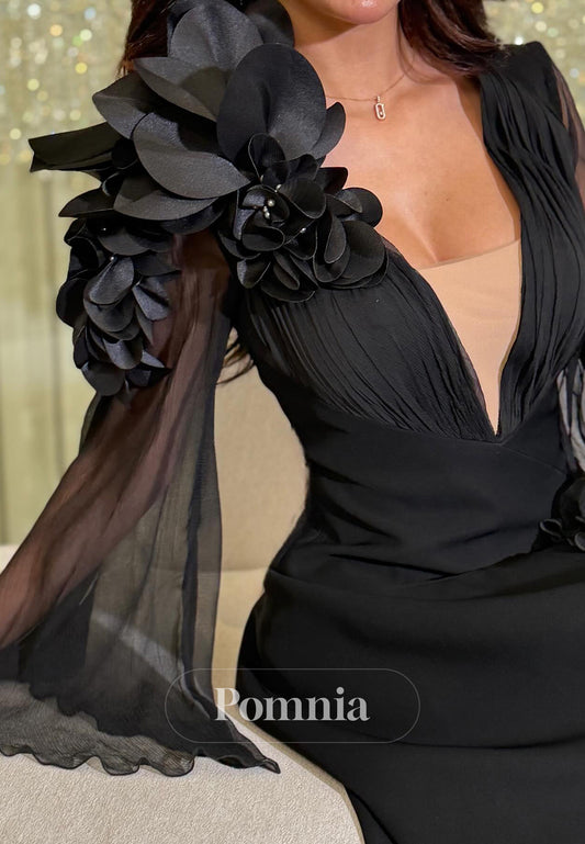 Black Long Sleeves V-Neck Floral Appliques Evening Dress