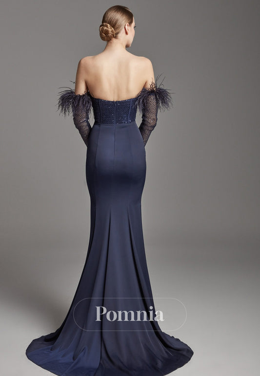 Dark Navy Off-Shoulder Long Sleeves Feathers Evening Dress