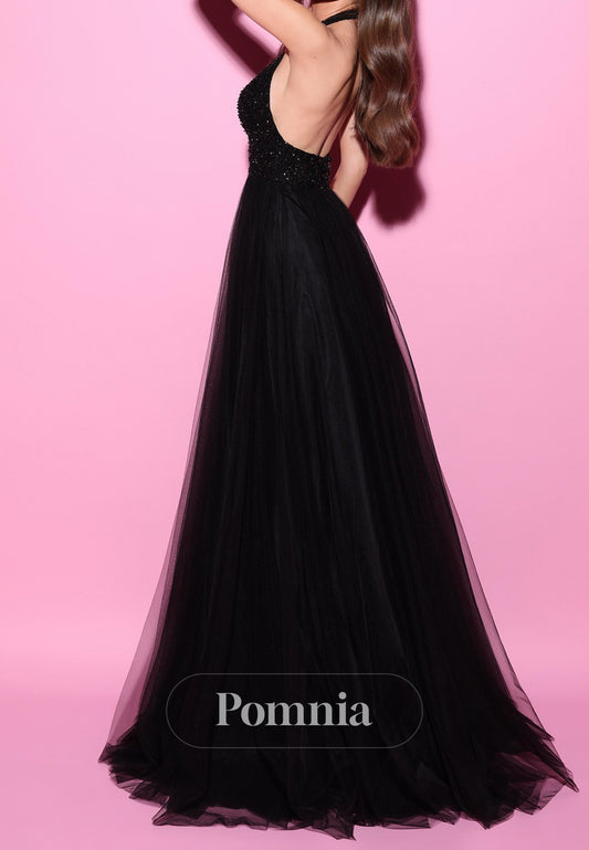 Black Halter Sleeveless Corset Tulle Evening Dress