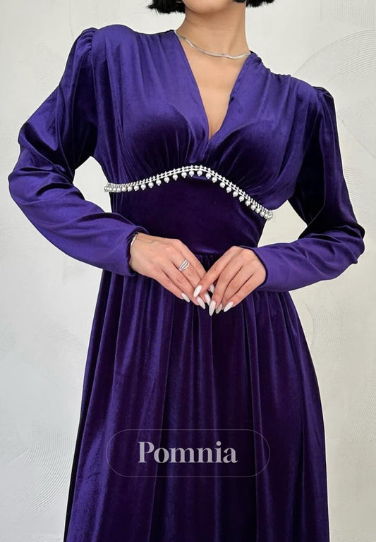 Velvet Pleats V-Neck Long Sleeves A-Line Evening Dress