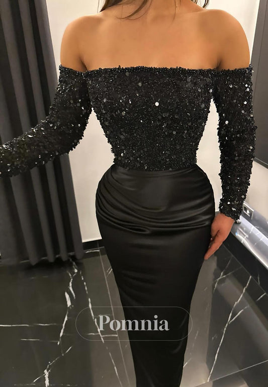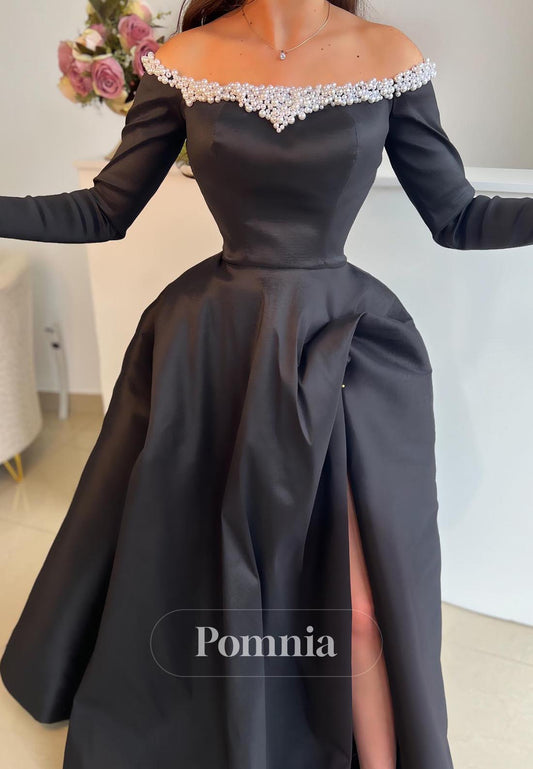 Black Long Sleeves Off-Shoulder Pearls Evening Dress