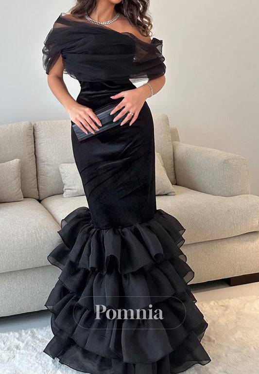Black Sleeveless Off-Shoulder Ruffles Evening Dress
