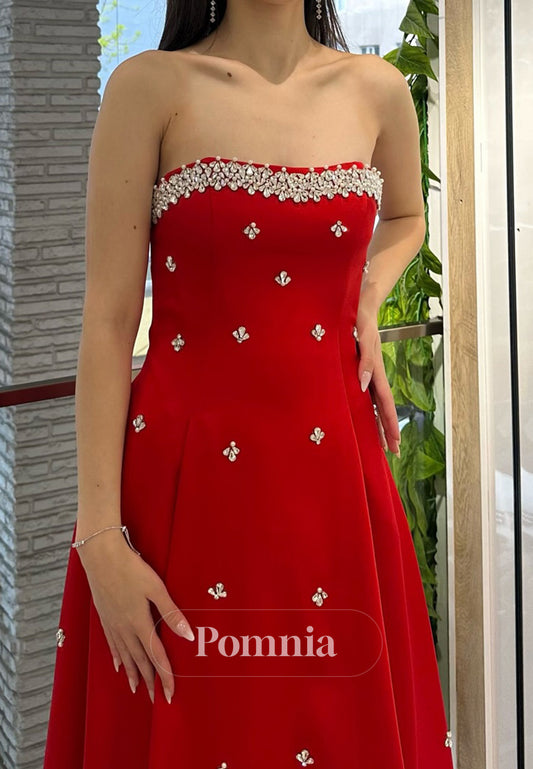 Red Strapless Sleeveless Beads Slit Evening Dress