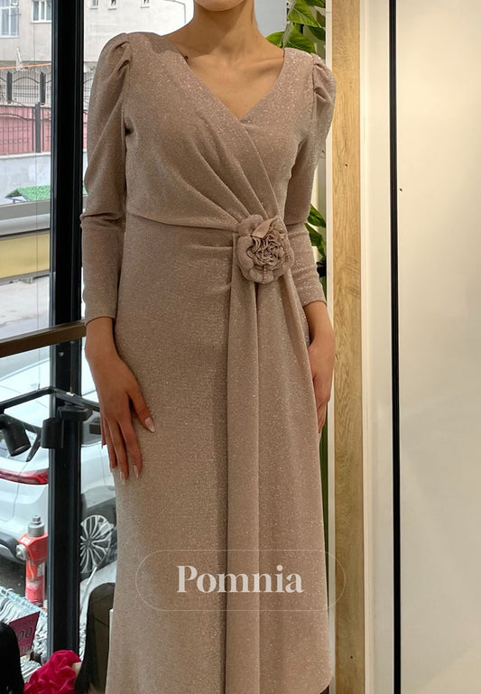 Long Sleeves V-Neck Floral Appliques Ruched Evening Dress