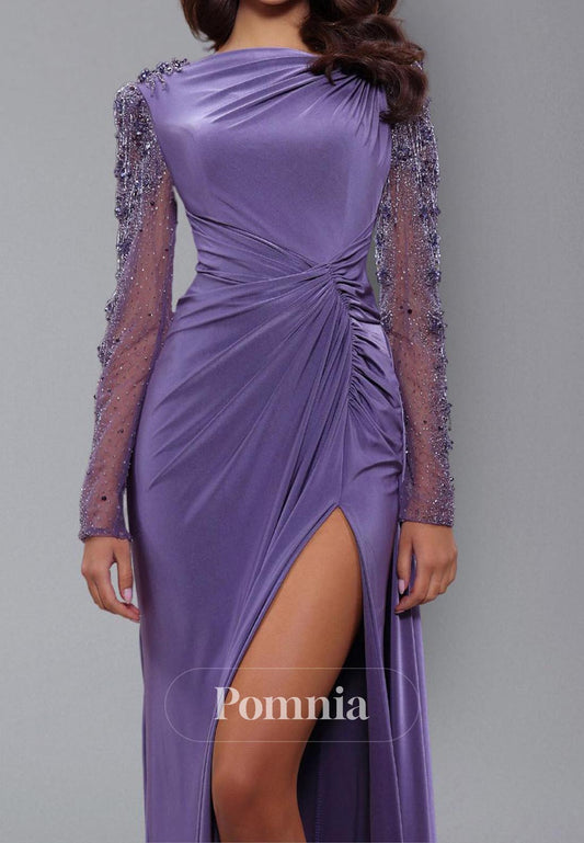 Lilac A-Line Long Sleeves Scoop Slit Ruched Evening Dress