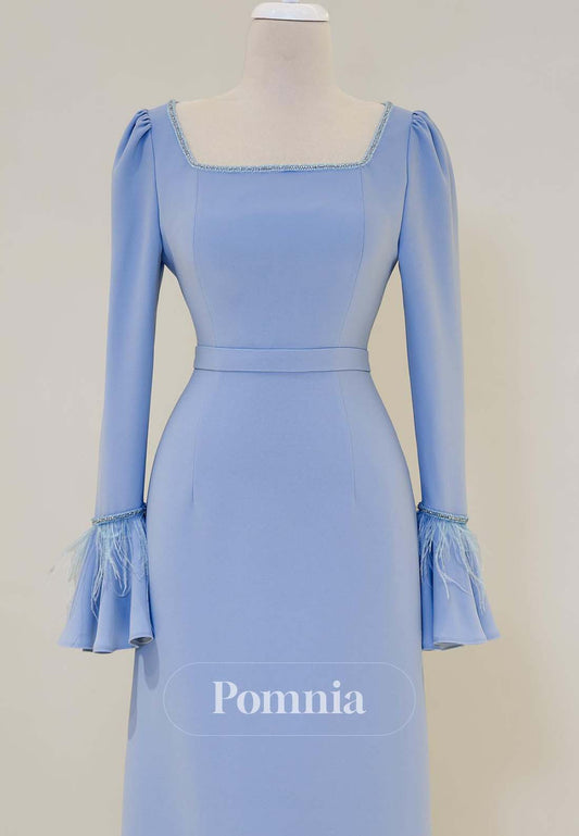 Sky Blue Long Sleeves Square Feathers Formal Evening Dress