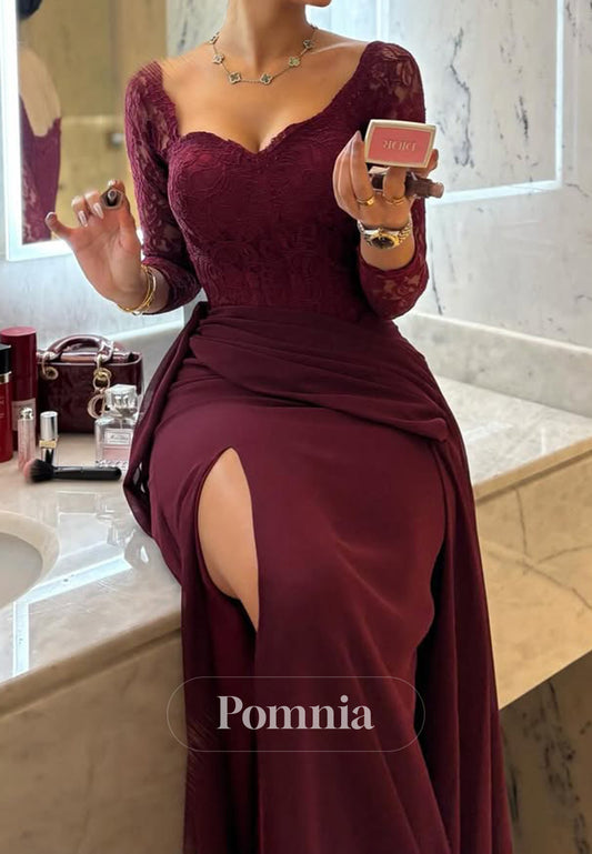 Simple Burgundy Long Sleeves Scoop Prom Dress with Slit Lace Party Dress
