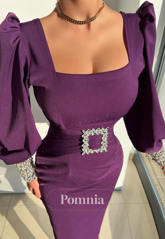 Raspberry Long Sleeves Square Beads Sheath Evening Dress