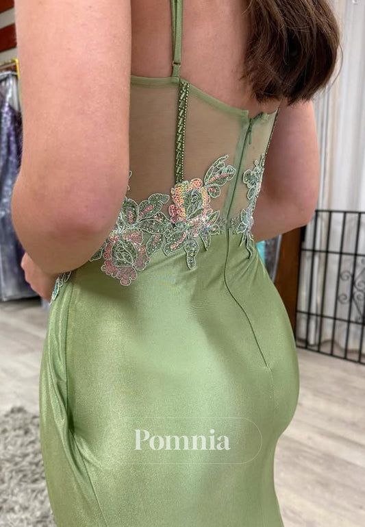 Lilac Spaghetti Straps V-Neck Prom Dress with Appliques Slit Evening Dress
