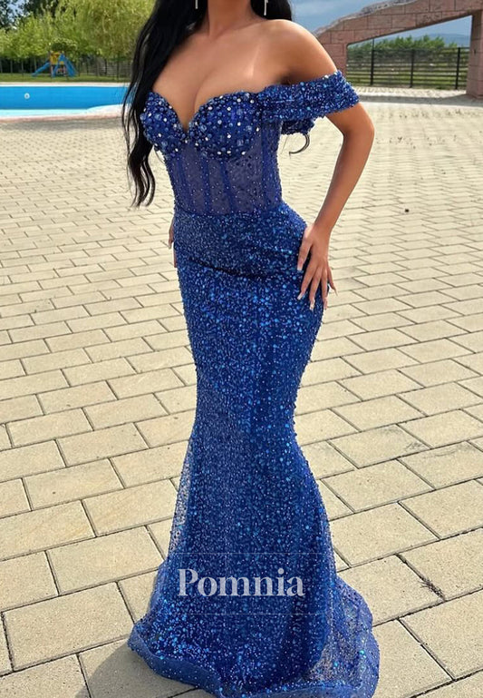 Dark Navy A-Line Off-Shoulder Prom Dress with Slit Corset Evening Party Dress