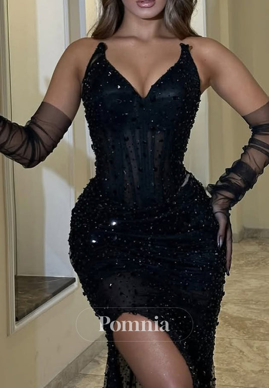 Black V-Neck Sleeveless Prom Dress with Slit Sequins Party Dress