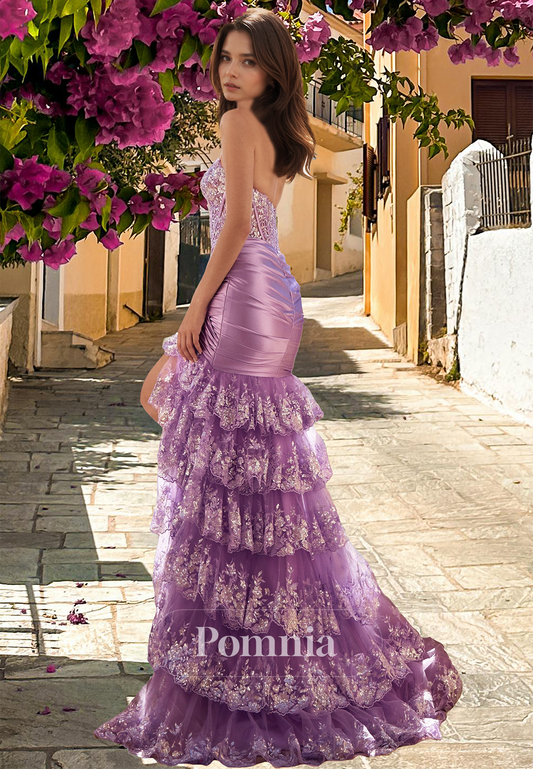 Lilac Sheath Strapless Sleeveless Prom Dress with Sequins Slit Evening Party Dress
