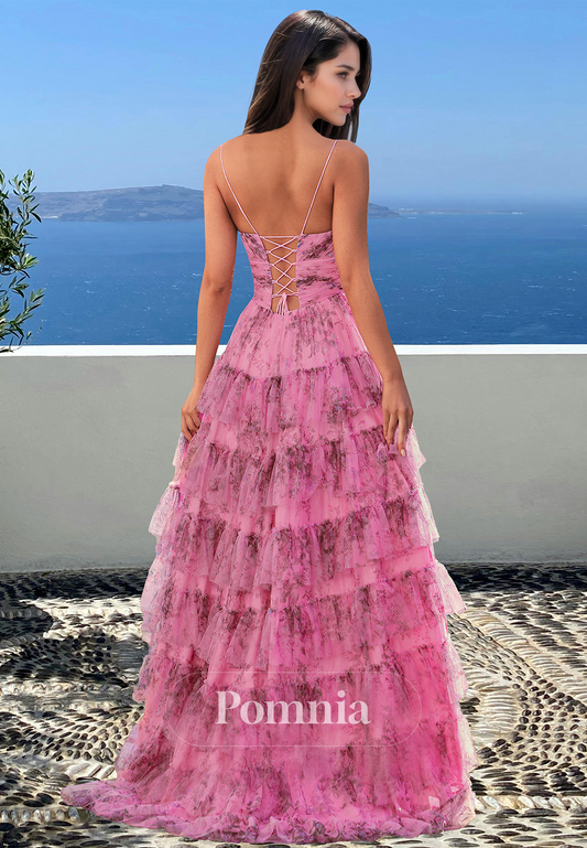 Chic A-Line Spaghetti Straps V-Neck Prom Dress with Ruffles Empire-Waist Evening Party Dress