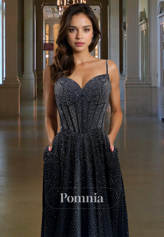 Black A-Line Spaghetti Straps Sweetheart Prom Dress with Sequins Backless Evening Party Dress