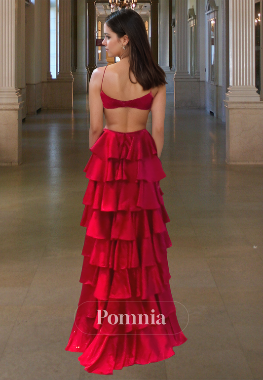 Red Spaghetti Straps V-Neck Prom Dress with Slit Ruffles Backless Evening Party Dress