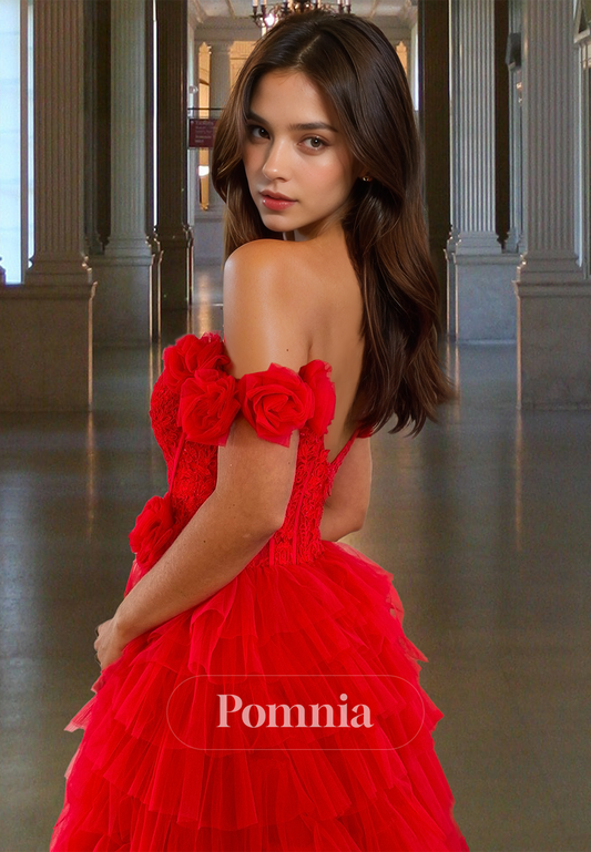 Red A-Line Off-Shoulder Backless Prom Dress with Train Empire-Waist Evening Party Dress