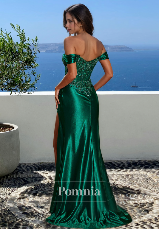 Dark Green Off-Shoulder Cap Sleeves Prom Dress with Slit Ruched Evening Party Dress