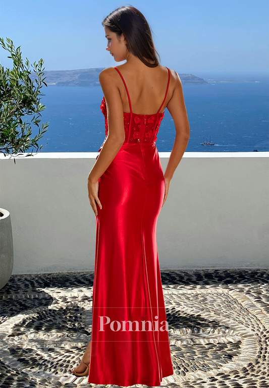 Chic Spaghetti Straps Sweetheart Prom Dress with Slit Floral Appliques Evening Party Dress