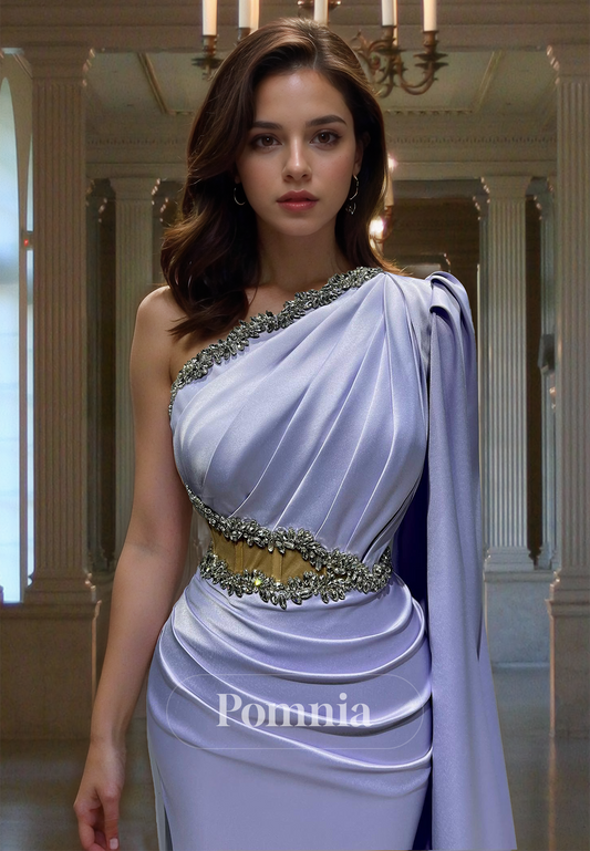 Lavender One Shoulder Cap Sleeves Prom Dress with Beads Slit Corset Evening Party Dress