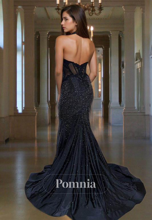 Black Deep V-Neck Halter Prom Dress with Sequins Illusion Corset Evening Party Dress