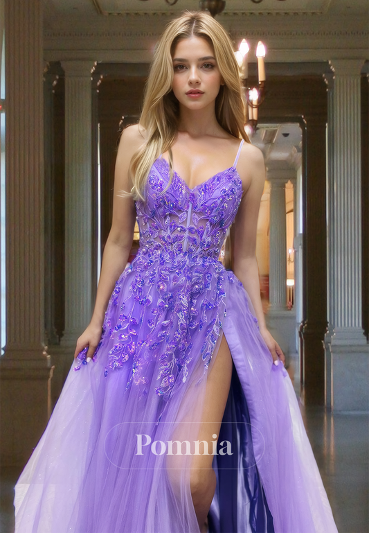 Lilac Spaghetti Straps V-Neck Illusion Corset Tulle Floor-Length Prom Party Dress