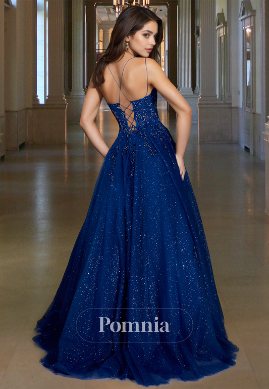 Royal Blue Spaghetti Straps Sweetheart Prom Dress with Slit Lace-Up Back Evening Party Dress