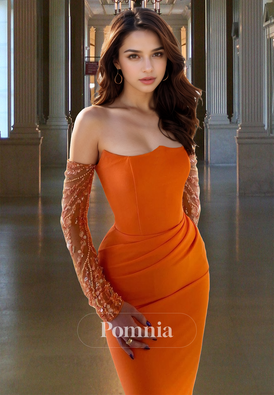 Papaya Off-Shoulder Long Sleeves Prom Dress with Pleats Ruched Evening Party Dress