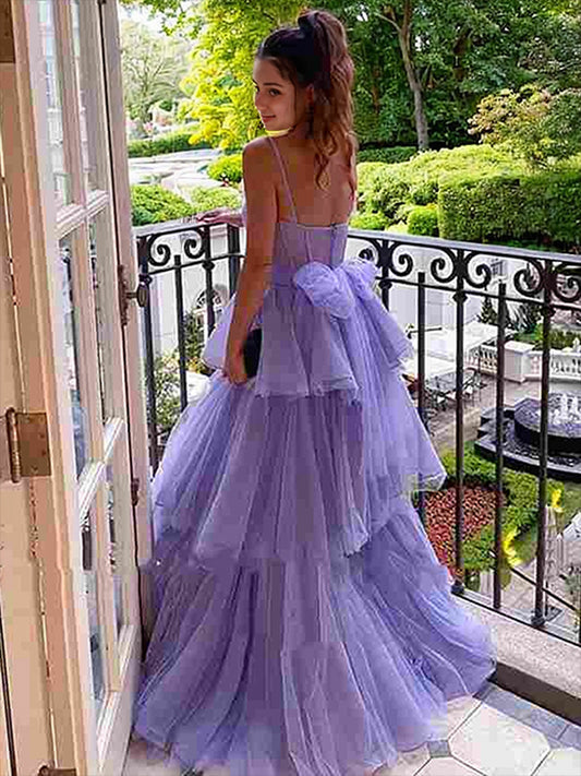 A-Line/Princess Tulle Layers Spaghetti Straps Sleeveless Floor-Length Dresses