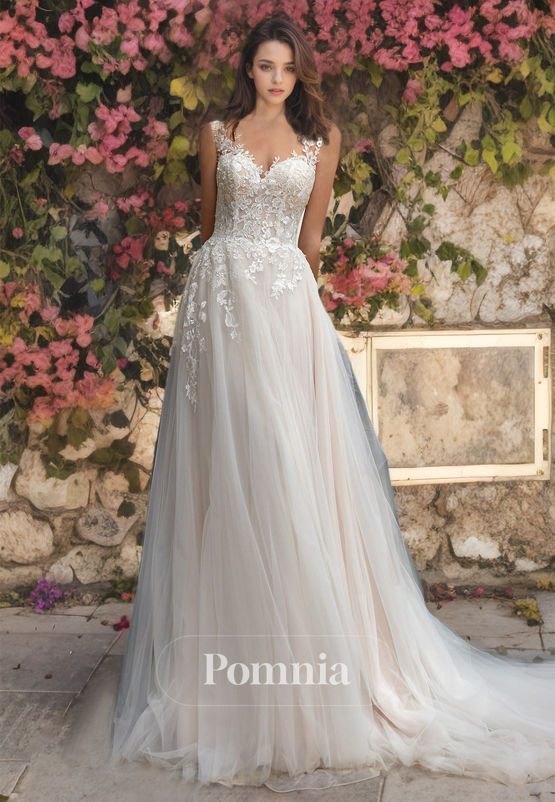 Discover elegance and romance with our A-Line Spaghetti Straps Floral Appliqued Court Train Lace Wedding Dress. Exquisitely crafted with delicate floral lace appliques, this dress features a figure-flattering A-line silhouette and romantic spaghetti straps. The court train adds a touch of drama, making this the perfect dress for your special day.