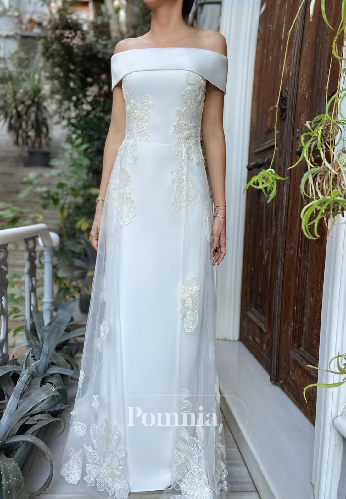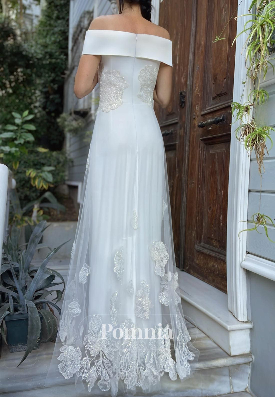 Simple A-Line Off-Shoulder Floral Appliques Satin Wedding Dress
