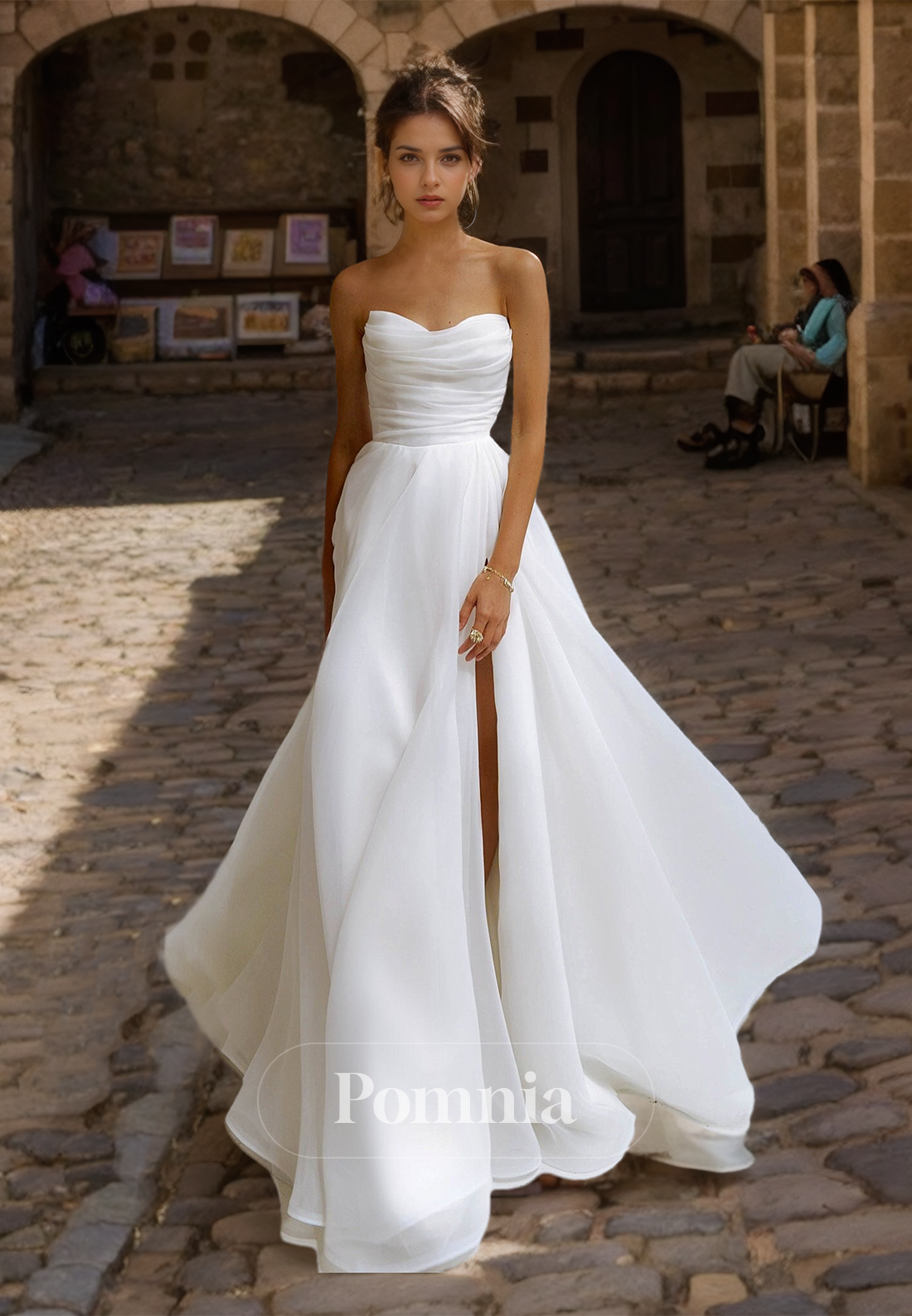 Simple A-Line Sleeveless Strapless Ruched Side Slit Satin Wedding Dress