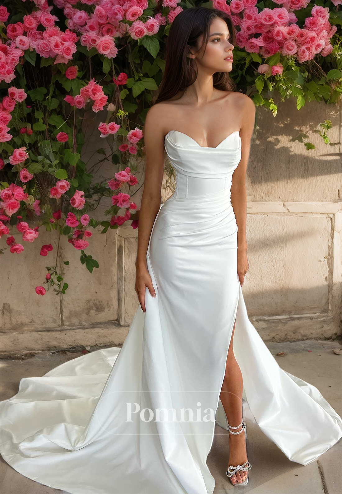 Simple Strapless Sleeveless Ruched Sweep Train Side Slit Satin Wedding Dress
