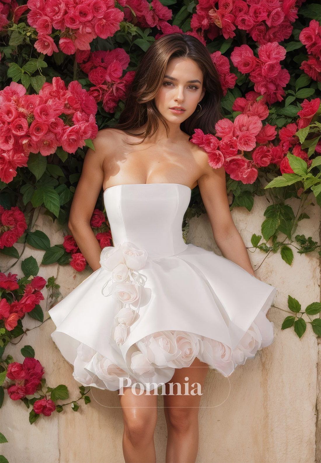 A-Line Strapless Sleeveless Empire-Waist Floral Short Satin Wedding Dress x 1;
