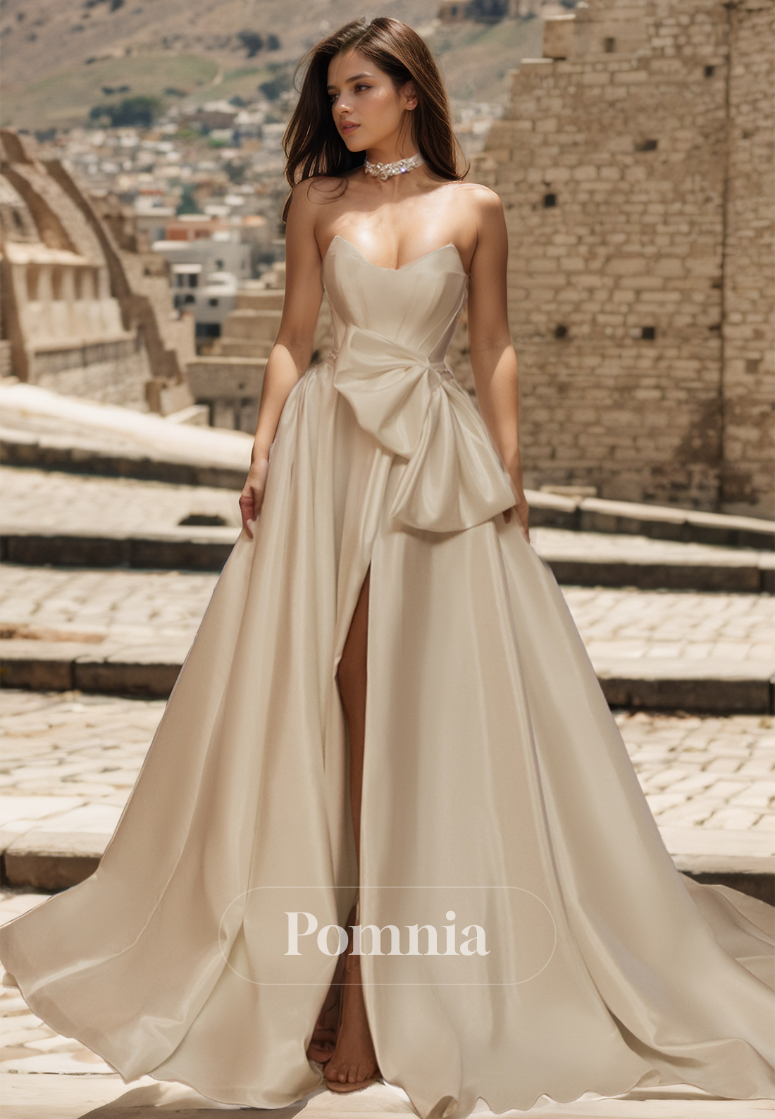 Elegant A-Line Strapless Backless Bowknot Side Slit Satin Wedding Dress