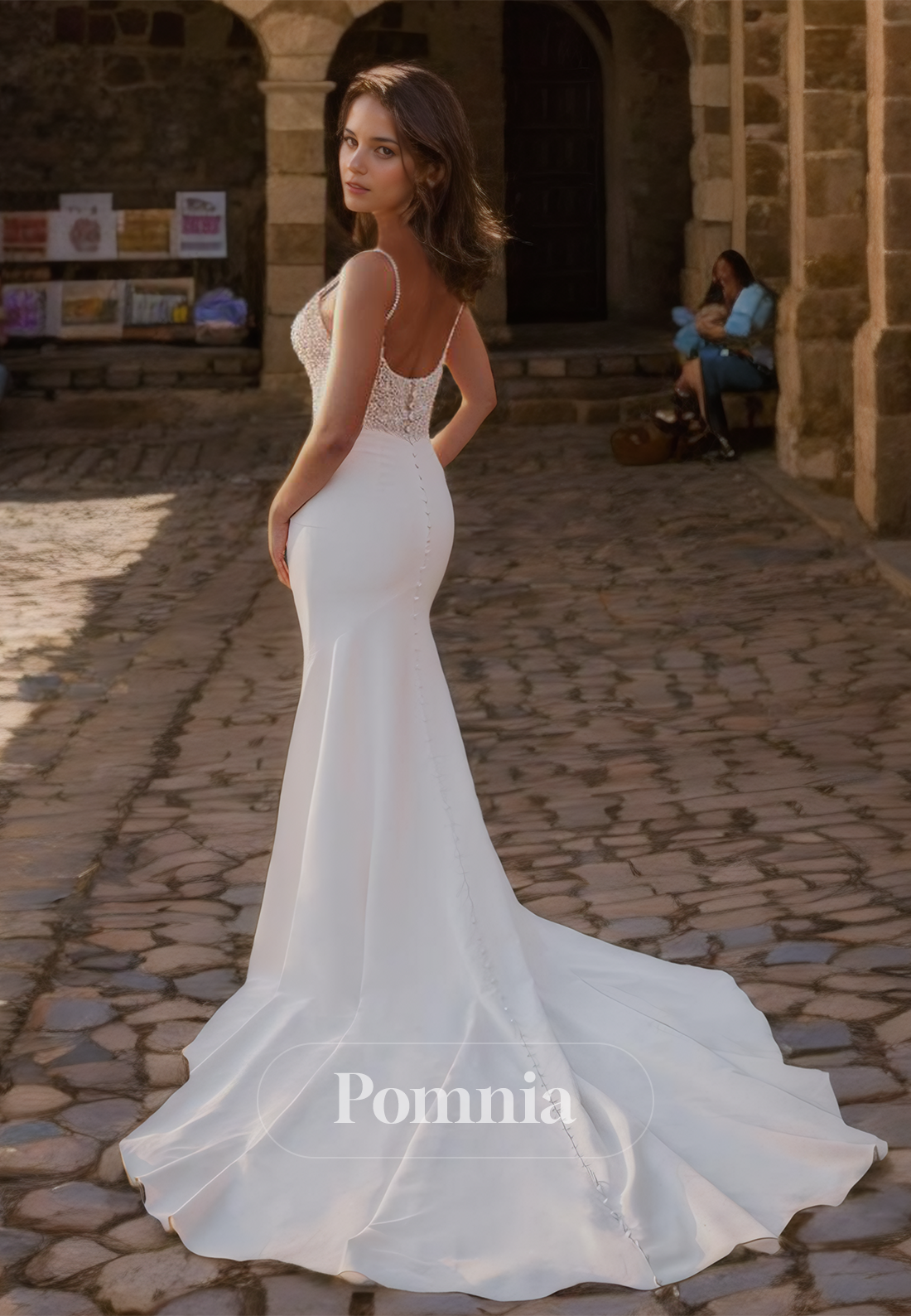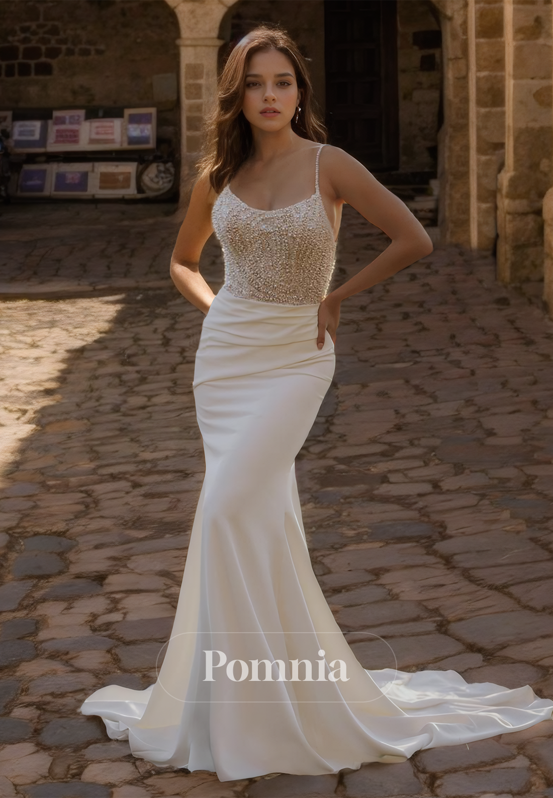 Spaghetti Straps Scoop Ruched Beads Sweep Train Mermaid Wedding Dress