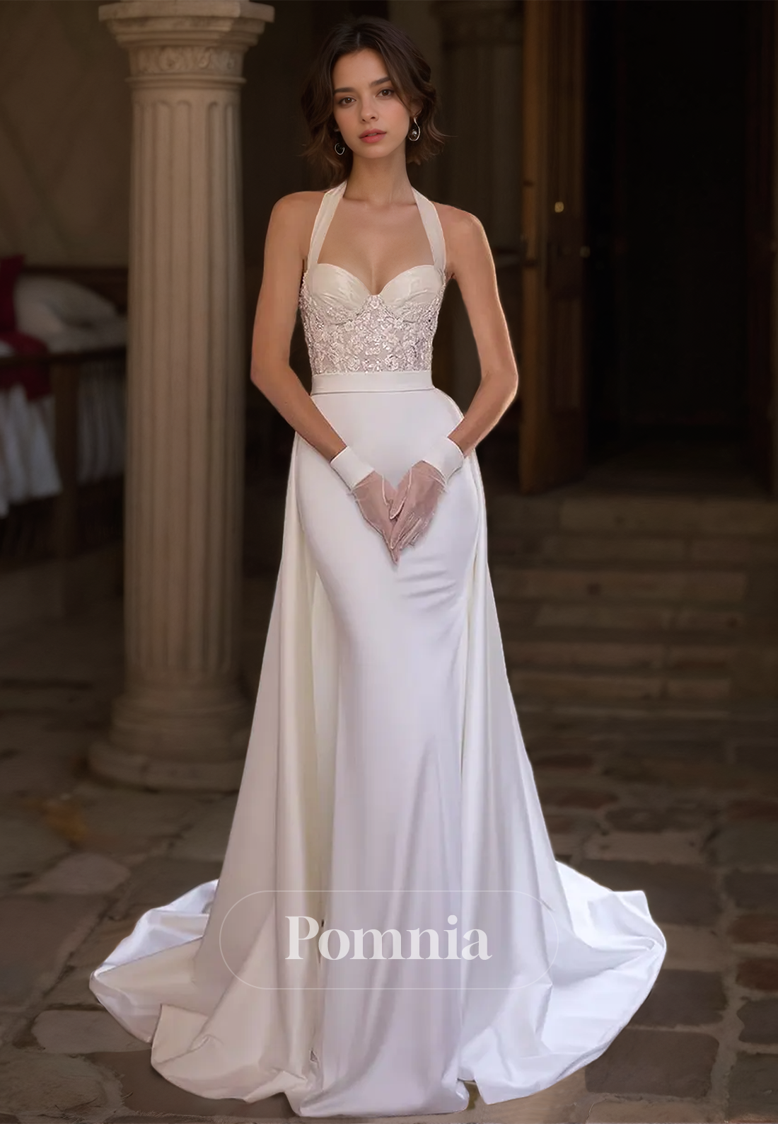 Halter Sleeveless Empire-Waist Backless Satin Mermaid Wedding Dress