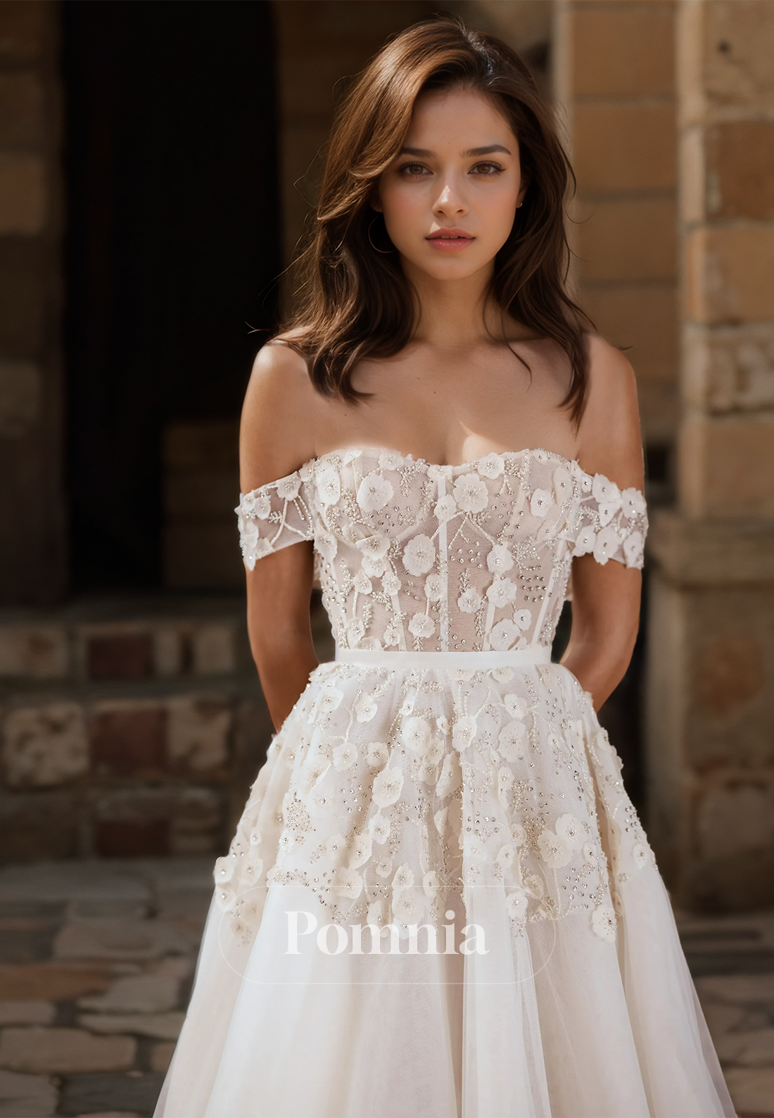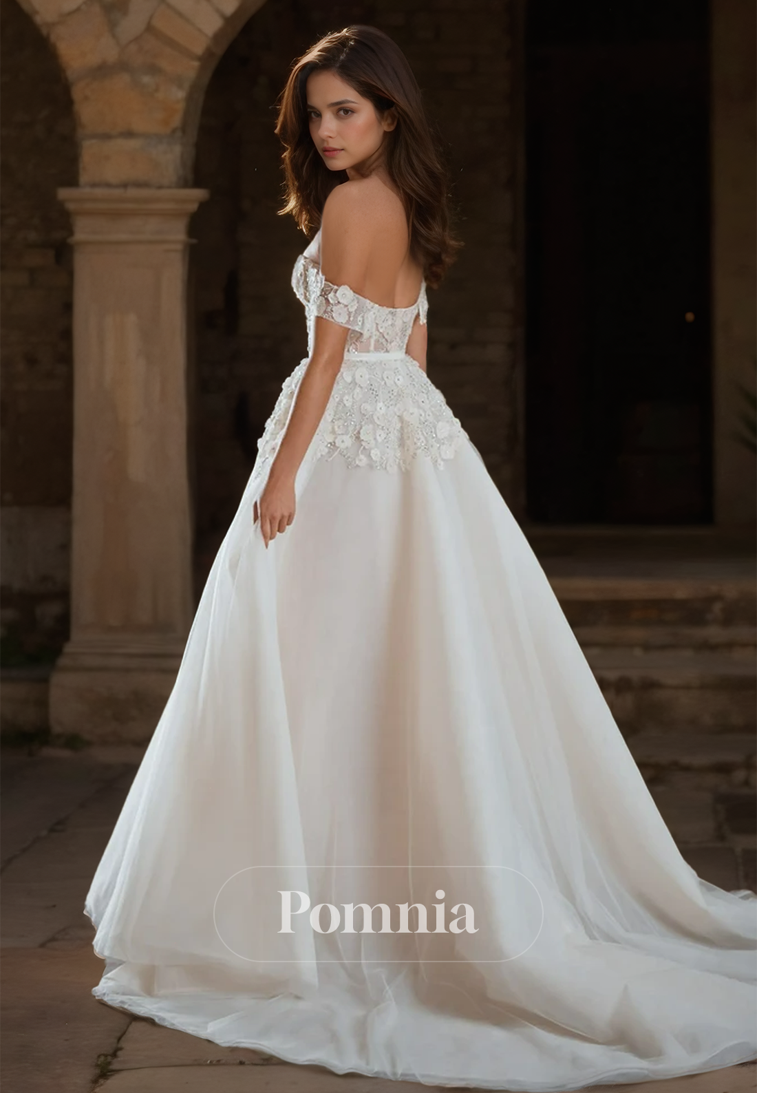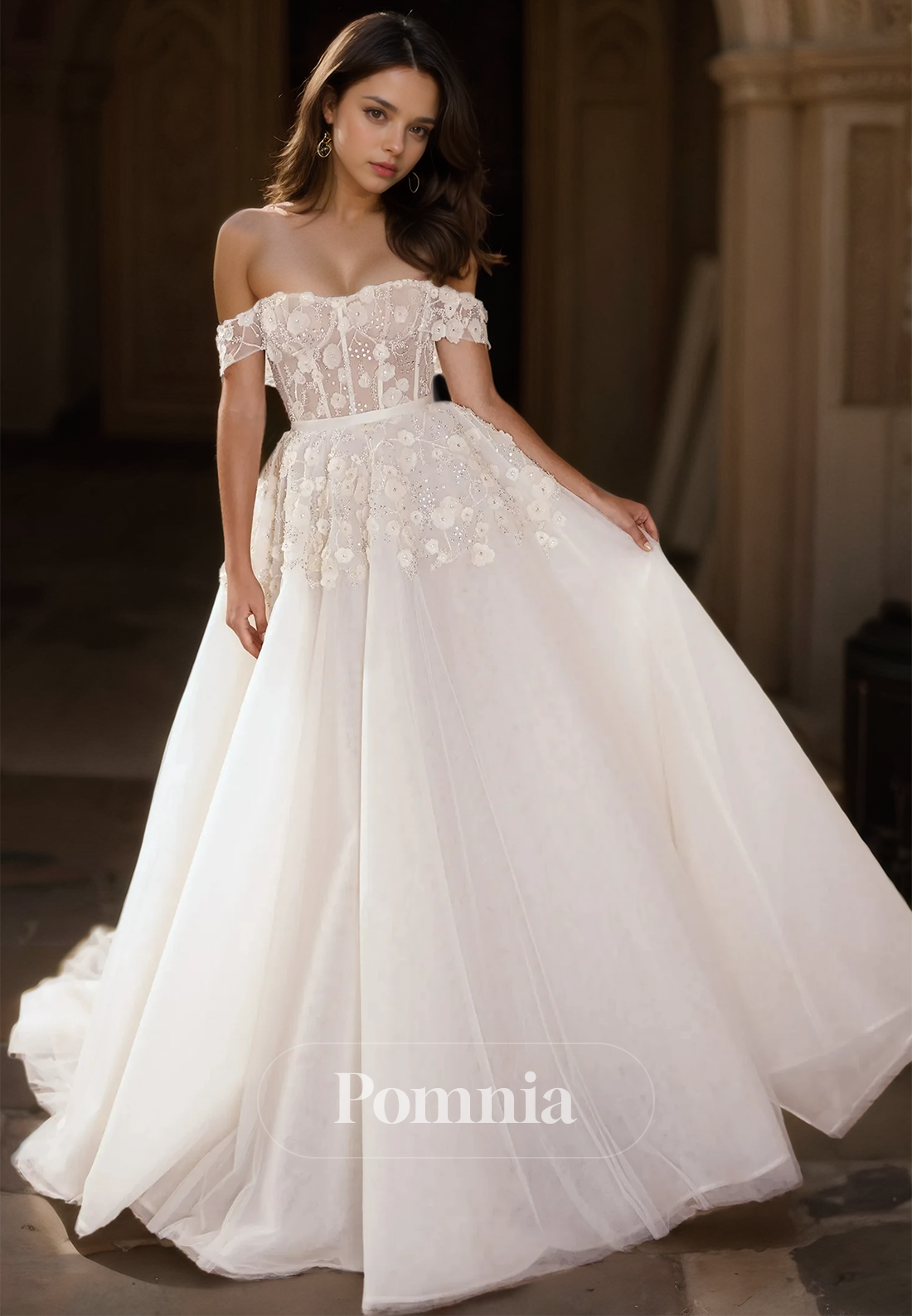 A-Line Off-Shoulder Floral Appliques Corset Sweep Train Lace Wedding Dress