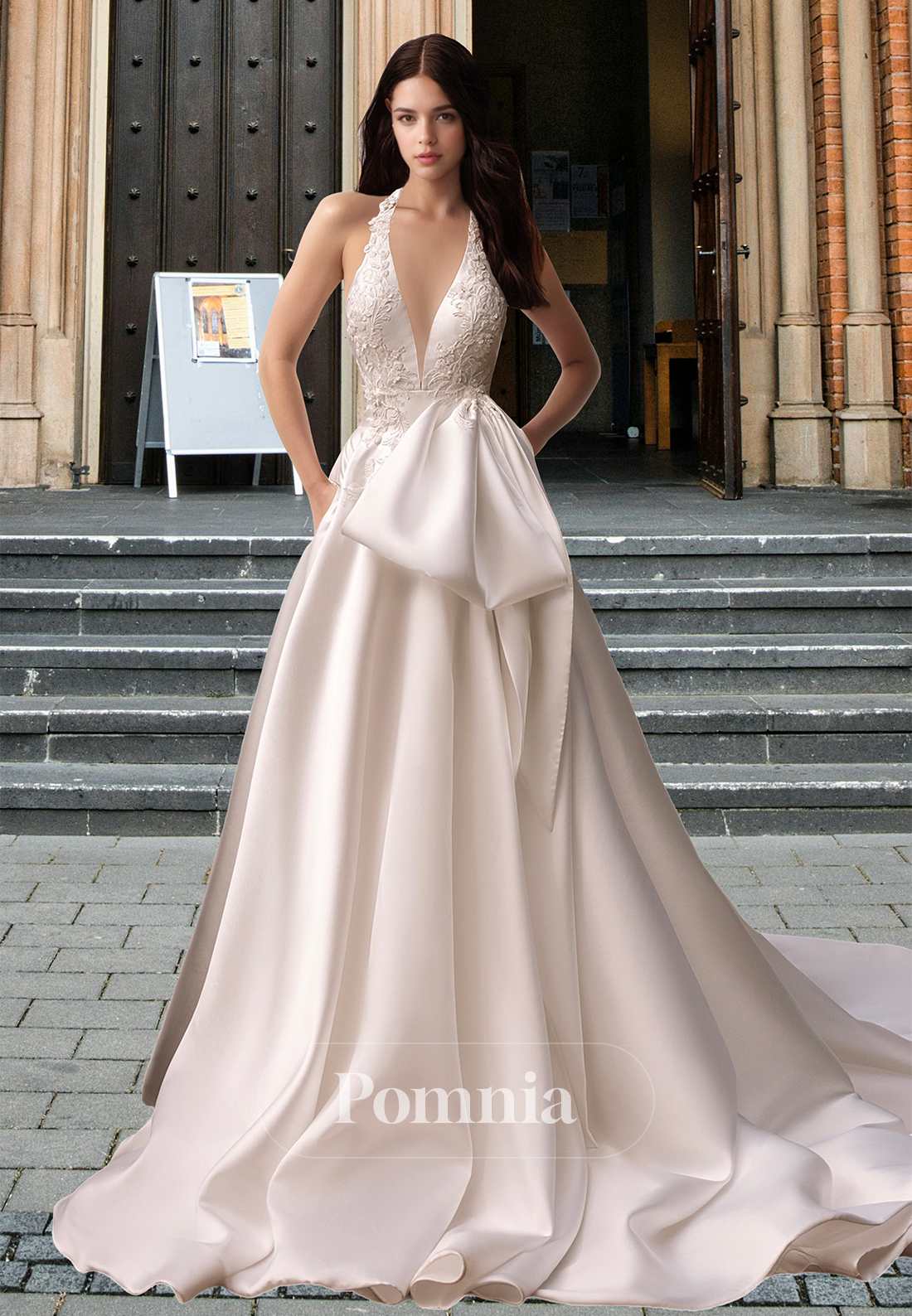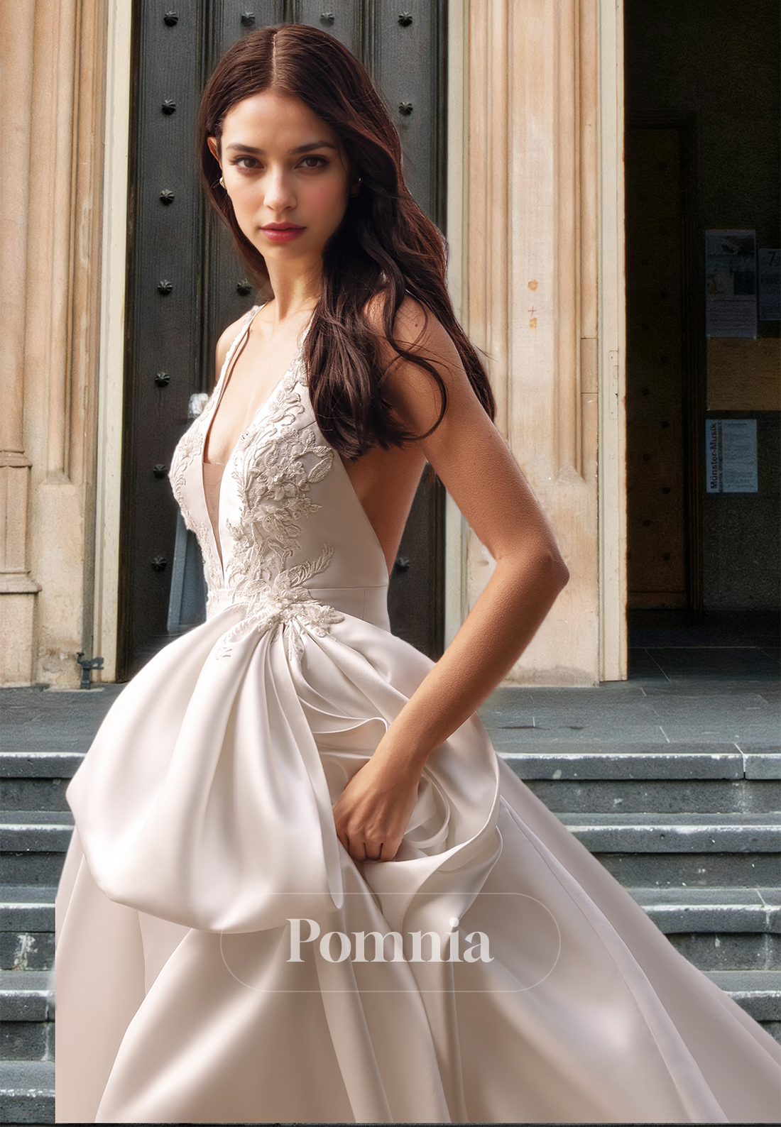 A-Line V-Neck Sleeveless Appliques Pleated Sleek Backless Satin Wedding Dress