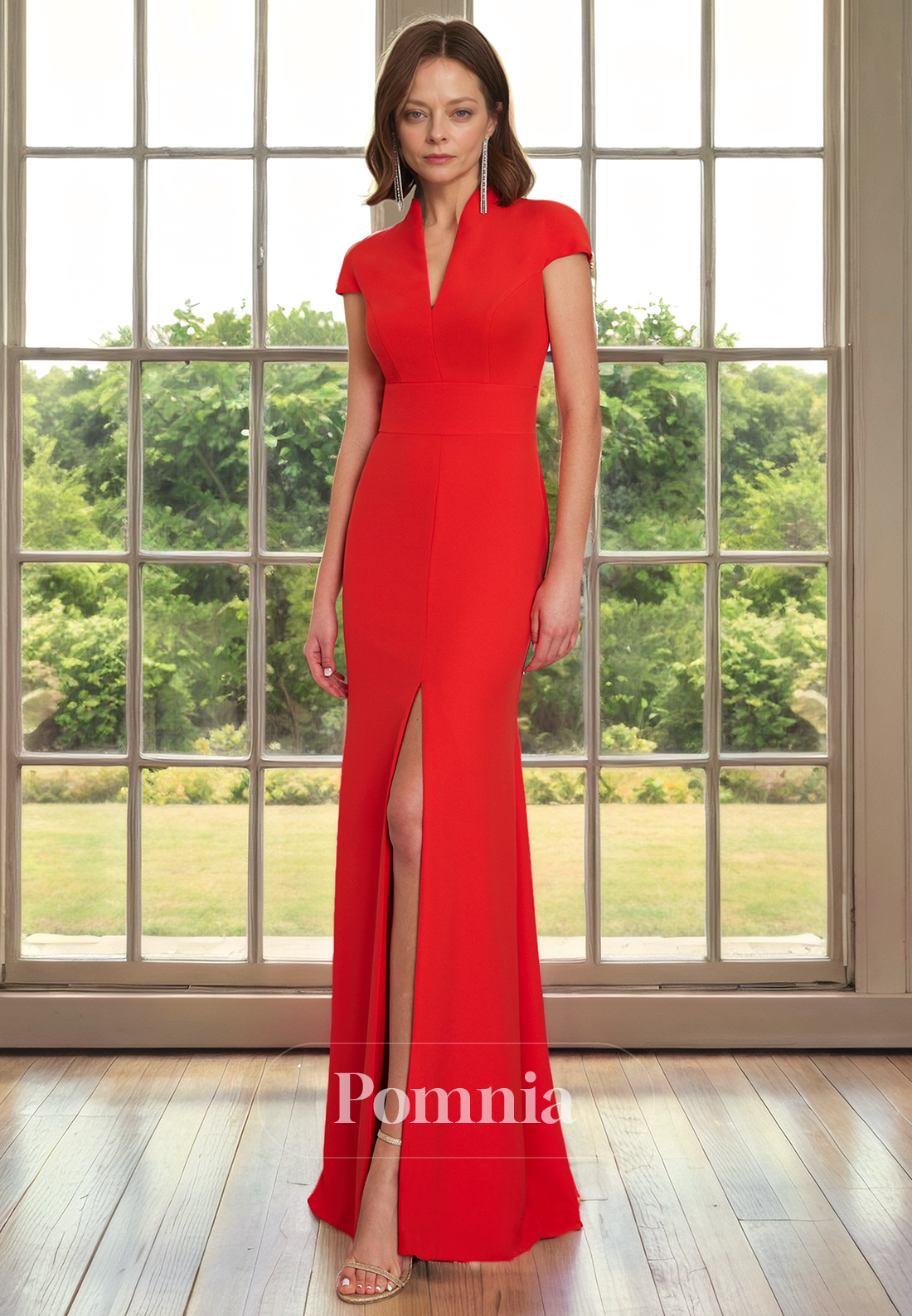 This elegant Mermaid/Trumpet V-Neck dress is crafted for the modern mother of the bride. The sleeveless design and side slit offer an alluring touch, while the long length adds sophistication. Perfect for any formal occasion.