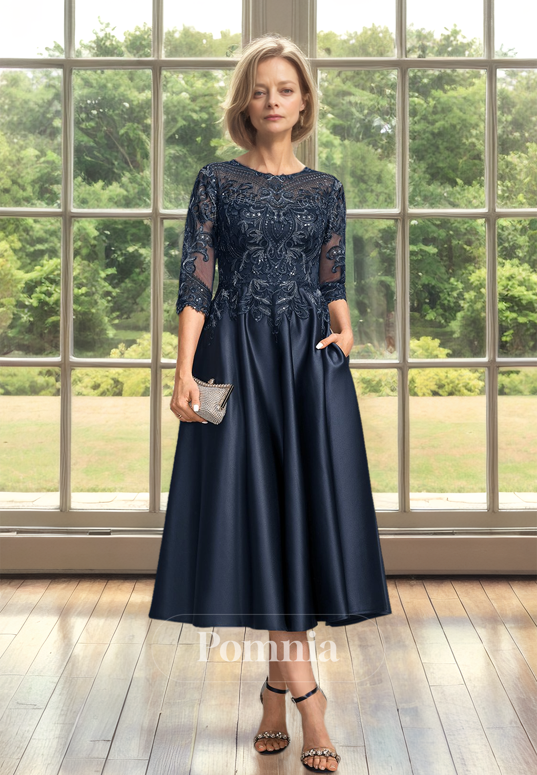 Dark Navy A-Line 3/4 Sleeves Floral Corset Tulle Ruched Short Satin Mother of the Bride Dress