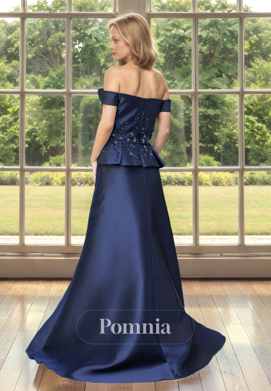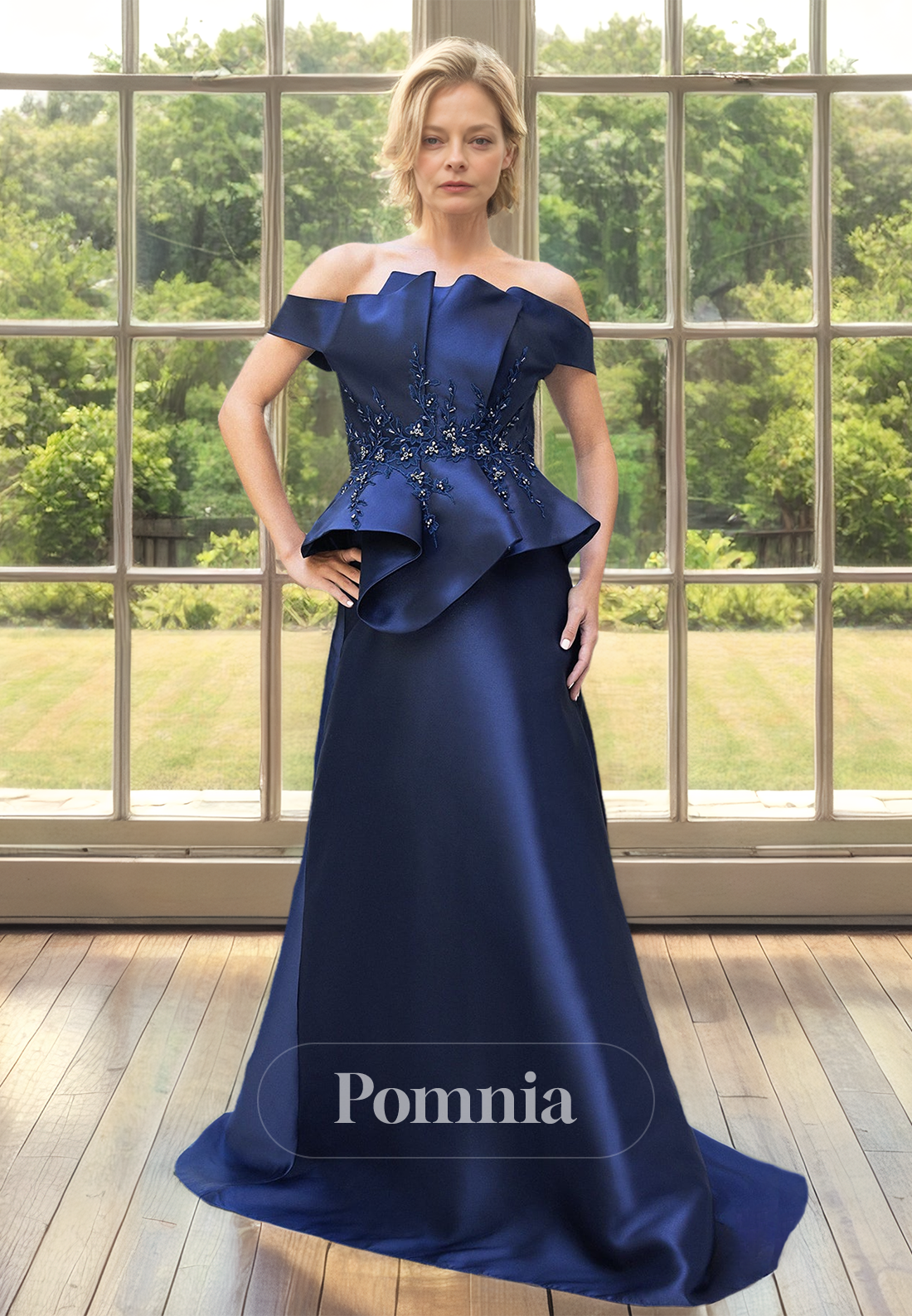 Off-Shoulder Floor-Length Empire-Waist Satin Mother of the Bride Dress